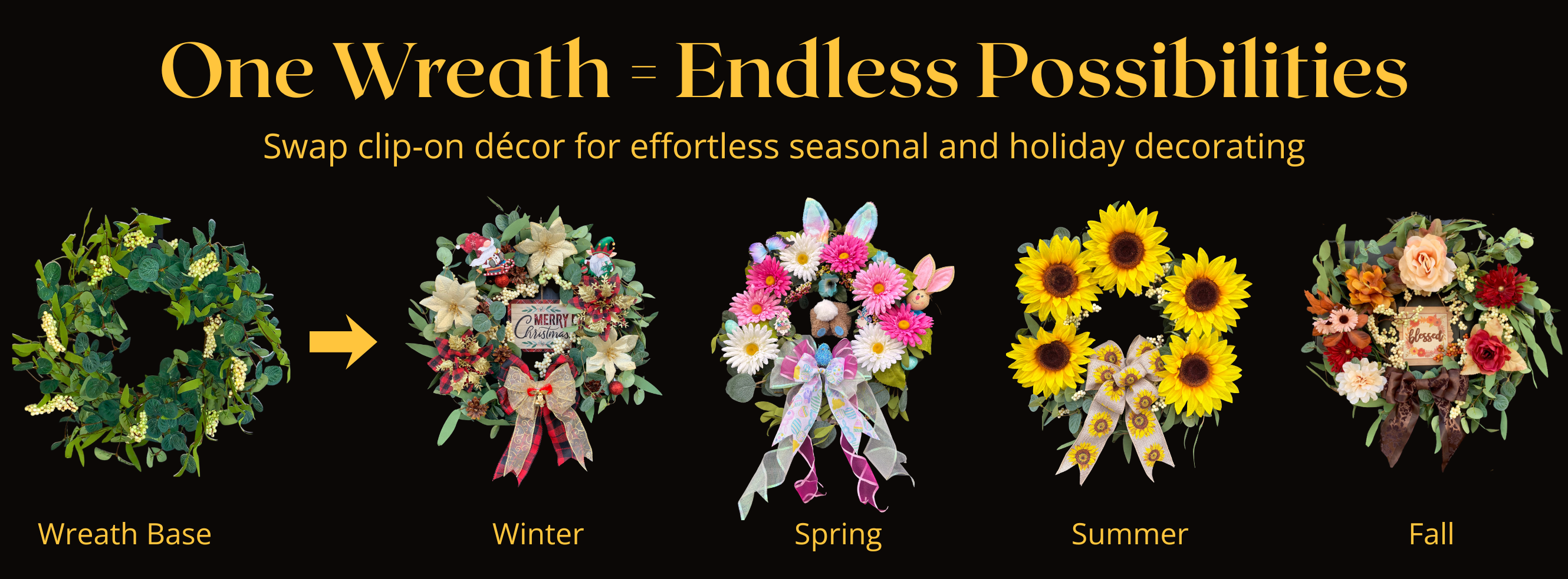 Our interchangeable wreath kits are more than just space saving decorations and unique gifts; they're a symbol of welcome, good cheer and creativity that allow effortless space saving change ups for seasons and holidays.