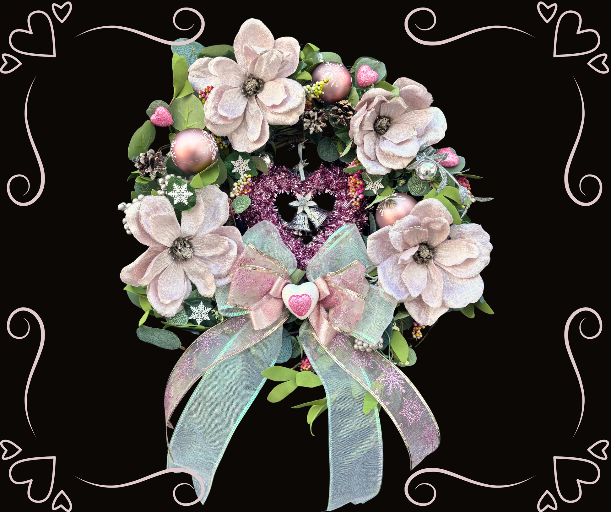 This kit features soft light-pink flowers with glittered tips and centers, snowflake ornaments, glitter pink heart accents for the bonus Valentine’s look, and a gorgeous three-layer wired ribbon bow with interchangeable magnetic centers. Every decorative piece clips on easily—meaning you can refresh your wreath during nap time, before work, or between activities in minutes. No crafting experience needed, no clutter, no stress… just beautiful décor that works around your life.